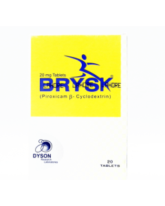 Brysk 20mg Tablets is a musculoskeletal tablet used for relief of pain, inflammation, and stiffness associated with arthritis, muscle injuries, or joint disorders. Manufactured by Dyson Research.