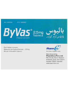 Byvas 2.5mg Tablets is a cardiovascular tablet used for management of heart and blood conditions including hypertension, heart failure, arrhythmia, or dyslipidemia. It helps maintain optimal cardiac function and blood pressure. Manufactured by Pharmevo.